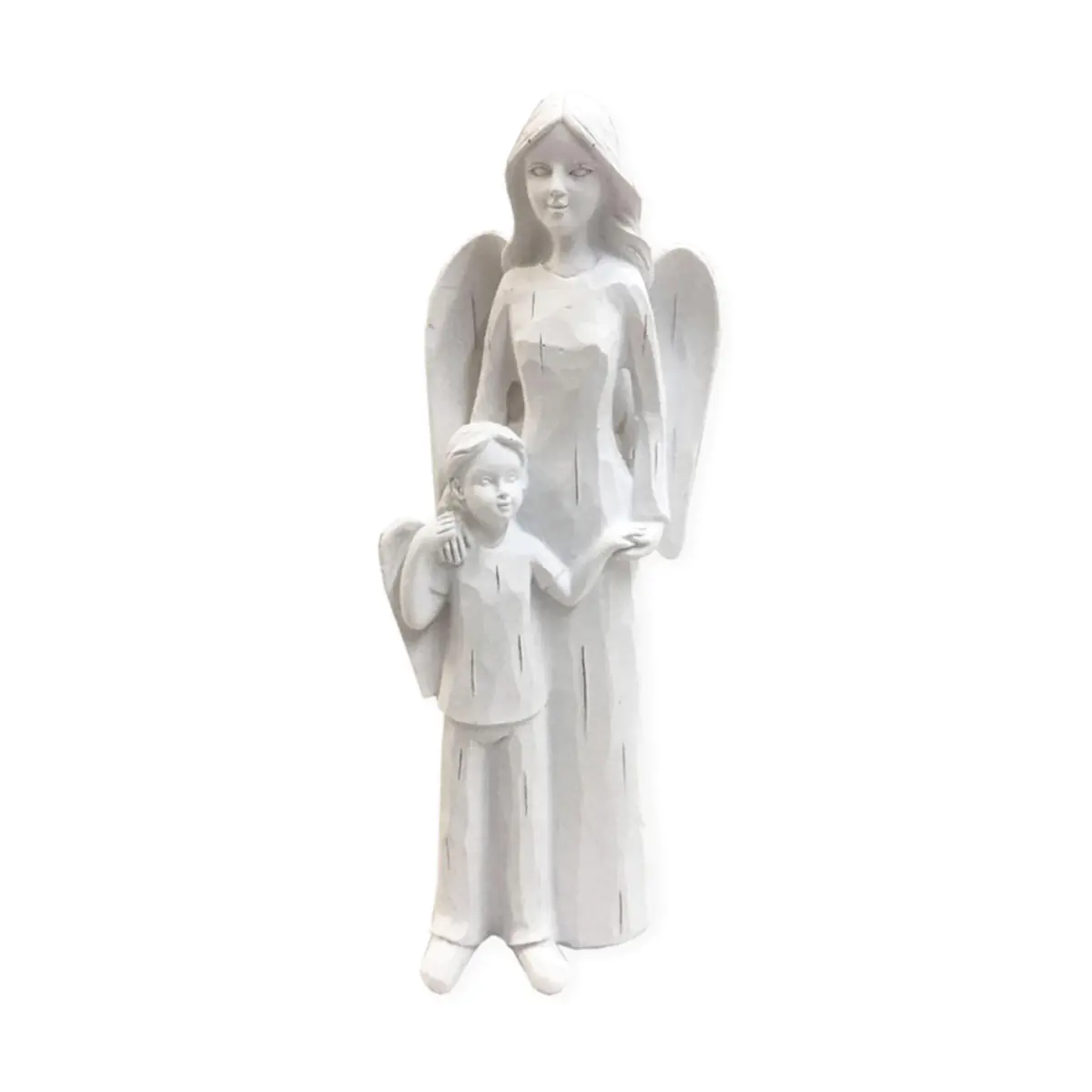Escultura de anjo com o menino, trabalhada em linhas simples e acabamento suave, que transmite uma forte sensação de proteção e proximidade.