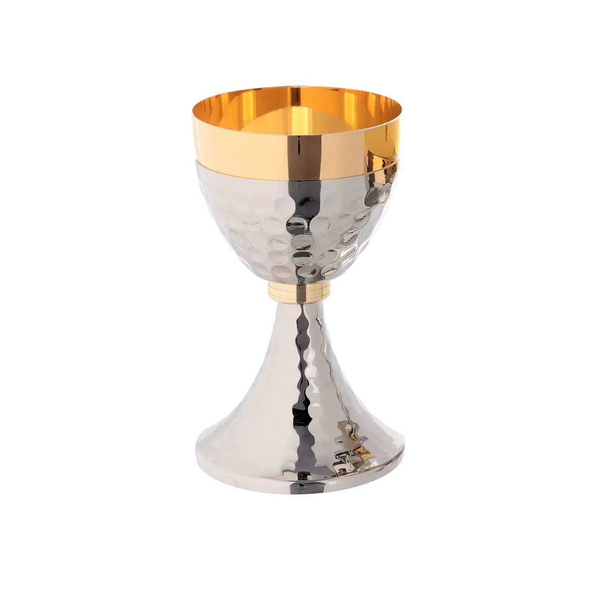 Cálice bicolor, copo e pé martelados nó simples. Cálice em latão dourado 24K no interior e prateado no exterior com acabamento martelado, simples mas refinado.