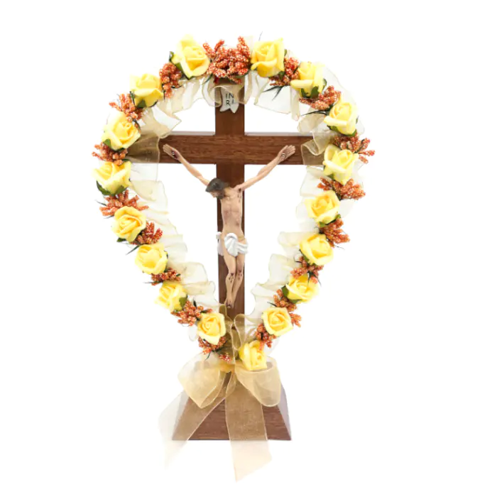 Crucifixo em madeira com base, Cristo pintado à mão, ornamentada à mão por mini flores em EVA e fita de organza. A composição da ornamentação do crucifixo é única e exclusiva não havendo repetição de padrão. Cores variadas.