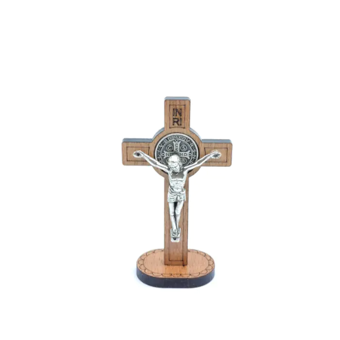 Crucifixo com medalha de S. bento inserida na cruz de madeira.