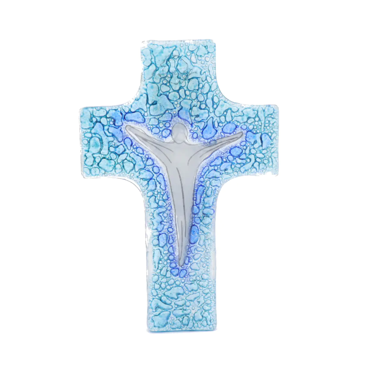 Crucifixo em vidro de Murano estilo moderno nuances de azul, 12x8 cm. Elegante crucifixo de estilo moderno realizado em vidro transparente de Murano com nuances de azul. Artigo de alta qualidade realizado à mão por artesãos do vidro.
