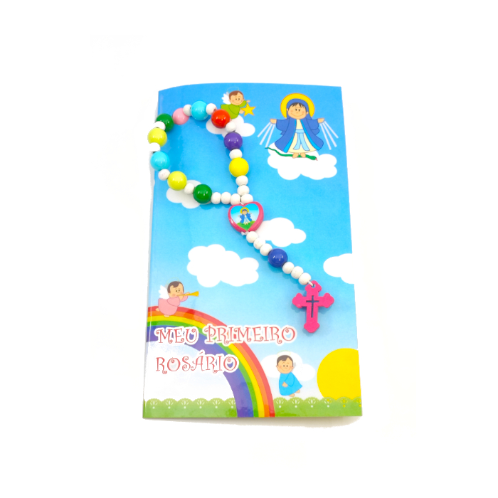 Dezena colorida o meu primeiro Rosário com livro com os mistérios (mistérios gozosos, mistérios dolorosos, mistérios gloriosos, mistérios luminosos). Existem 4 grupos de Mistérios: de alegria, de dor, de glória e de luz.