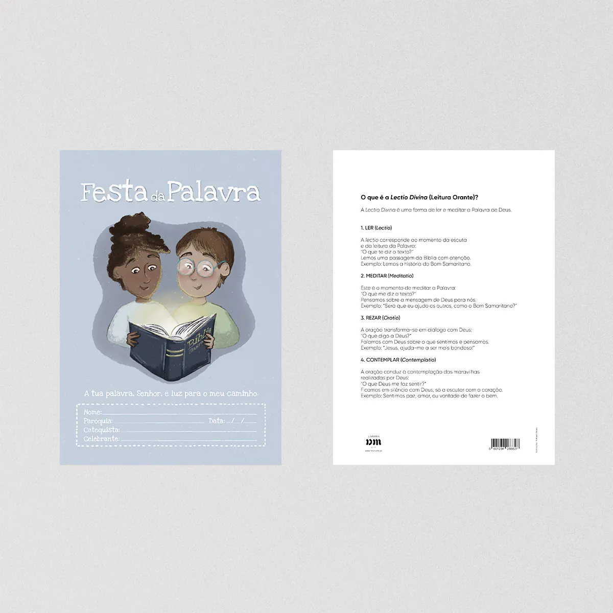 A frente apresenta uma ilustração simbólica de duas crianças iluminadas pela Bíblia, com a frase: «A tua palavra, Senhor, é luz para o meu caminho».