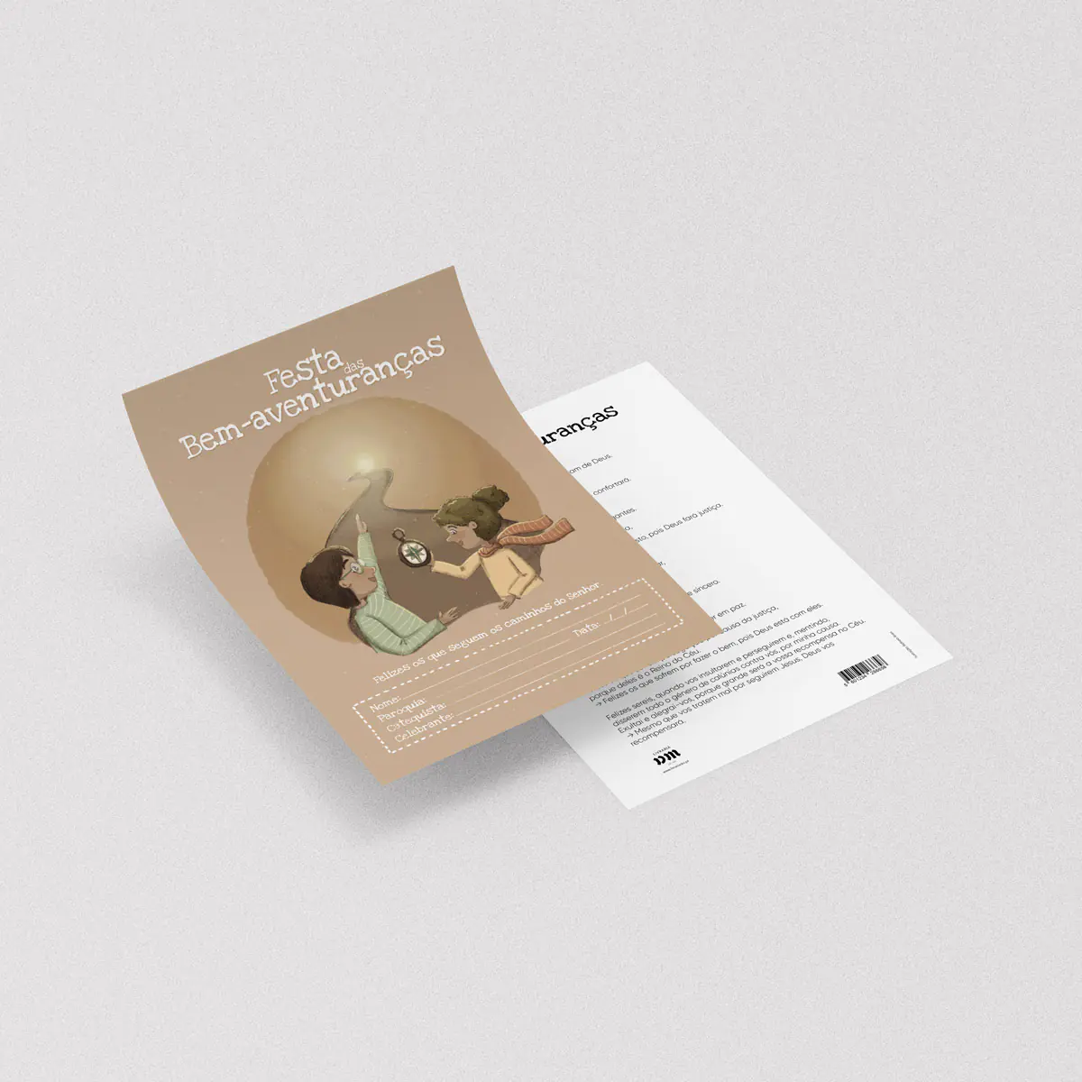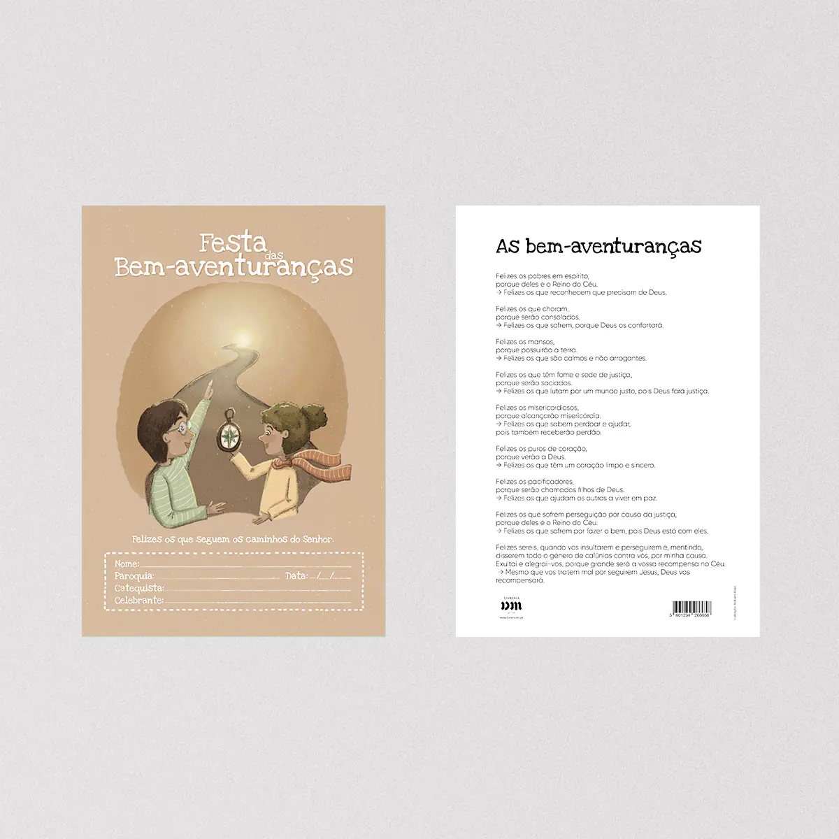 Na frente, duas crianças seguem com uma bússola o caminho da luz, acompanhadas da frase: «Felizes os que seguem os caminhos do Senhor».