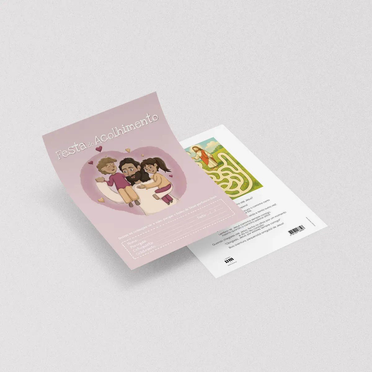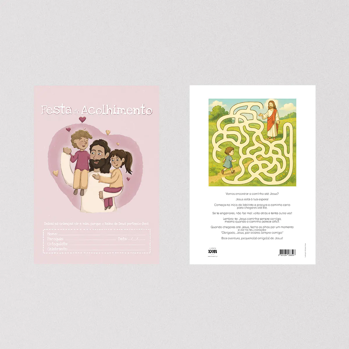No verso, contém um labirinto divertido com uma mensagem catequética encorajadora, ajudando as crianças a compreender que Jesus está sempre à sua espera. Ideal para recordar com alegria o primeiro encontro com a comunidade cristã.