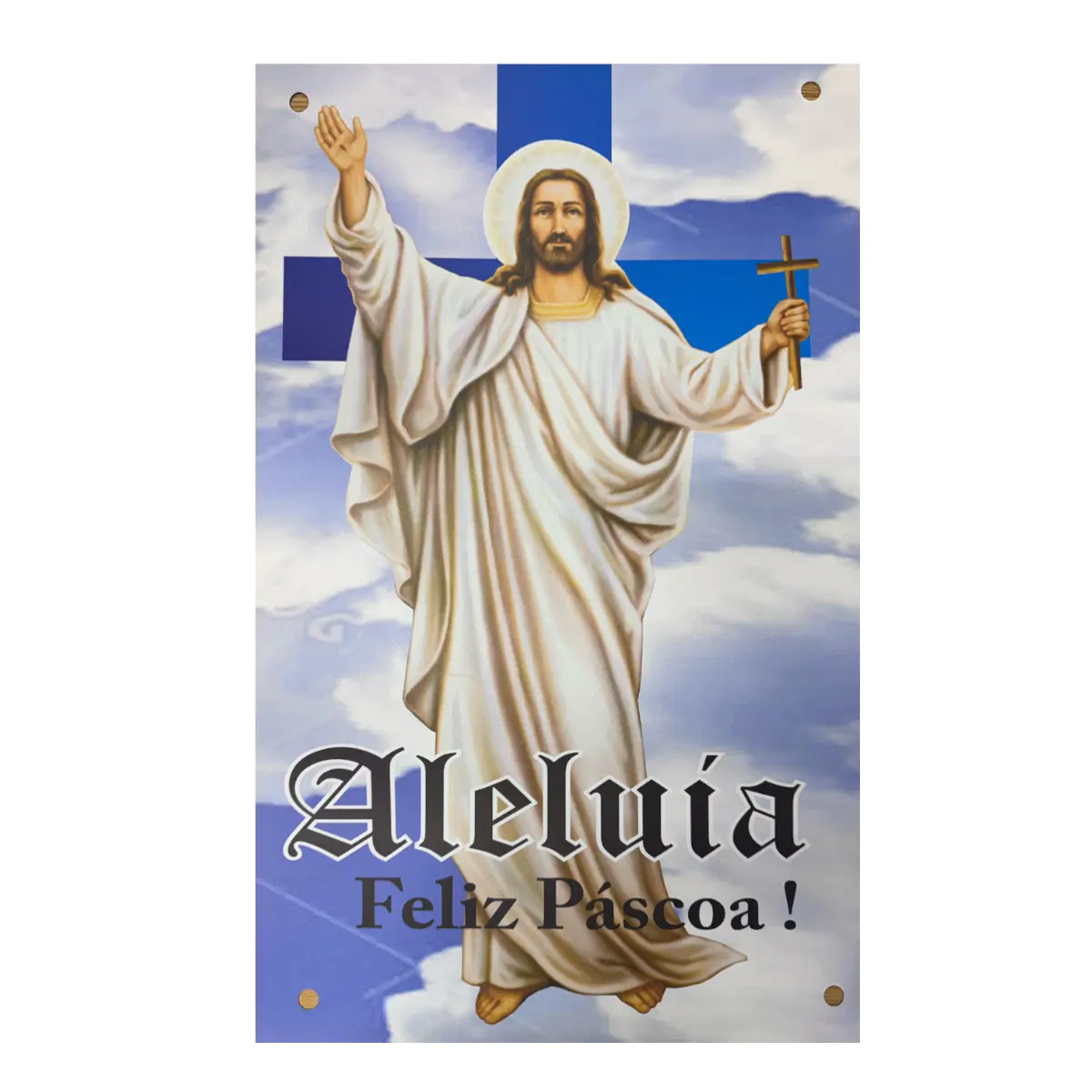 Estandarte em tecido lona estampado com imagem de Jesus Ressuscitado.