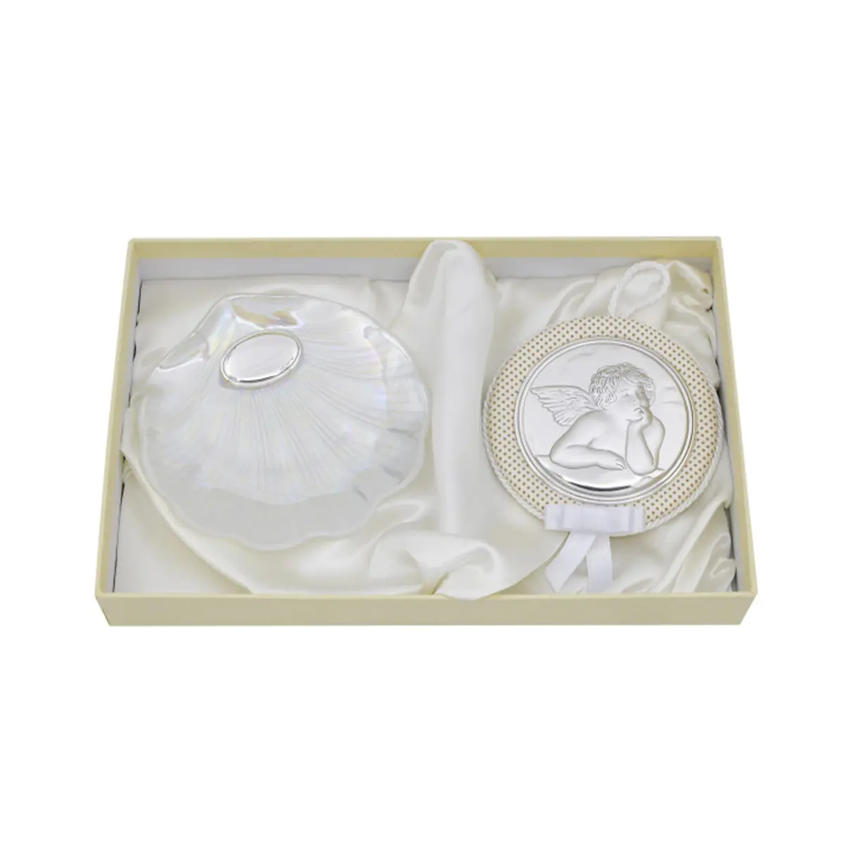 A concha, símbolo da água baptismal, e a medalha, com motivo angelical, evocam a protecção, a graça e o início da vida cristã. Um conjunto delicado e significativo, próprio para assinalar o sacramento do Baptismo com sobriedade e sentido espiritual.