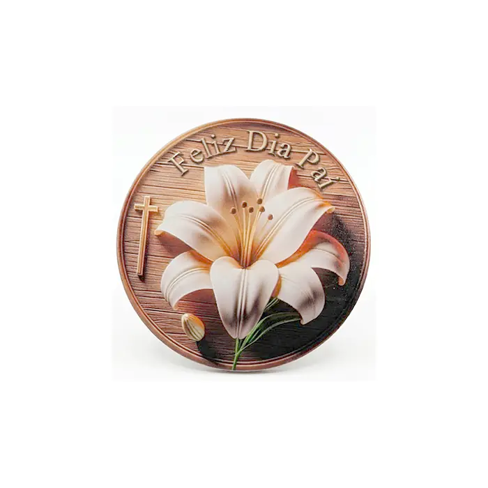 Íman redondo “Feliz Dia Pai”, com acabamento em relevo e imagem de lírio branco sobre fundo de textura amadeirada.