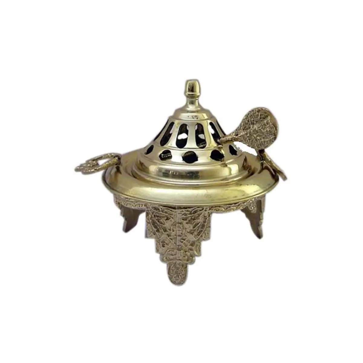 O topo perfurado permite uma ventilação eficaz enquanto protege o carvão ou resina no seu interior. As alças decorativas e os pés esculpidos conferem estabilidade e um toque artístico, tornando-o também uma peça decorativa.