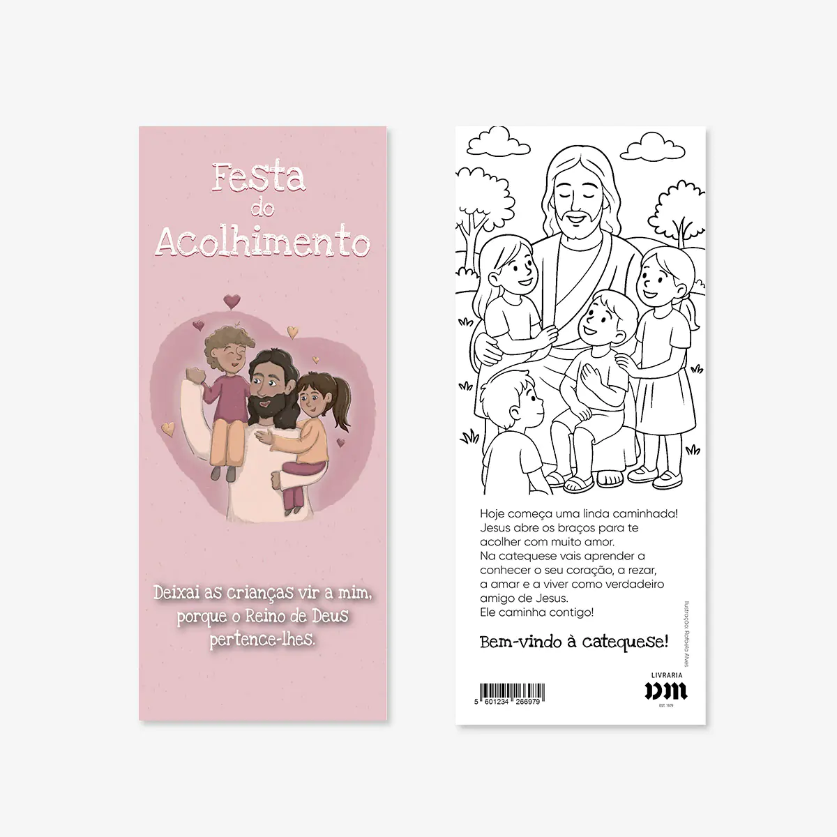 No verso, apresenta uma imagem para colorir com Jesus rodeado de crianças, acompanhada de uma mensagem de boas-vindas simples e alegre: «Bem-vindo à catequese!». Um recurso ideal para o primeiro encontro com a fé, combinando acolhimento, criatividade e espiritualidade.