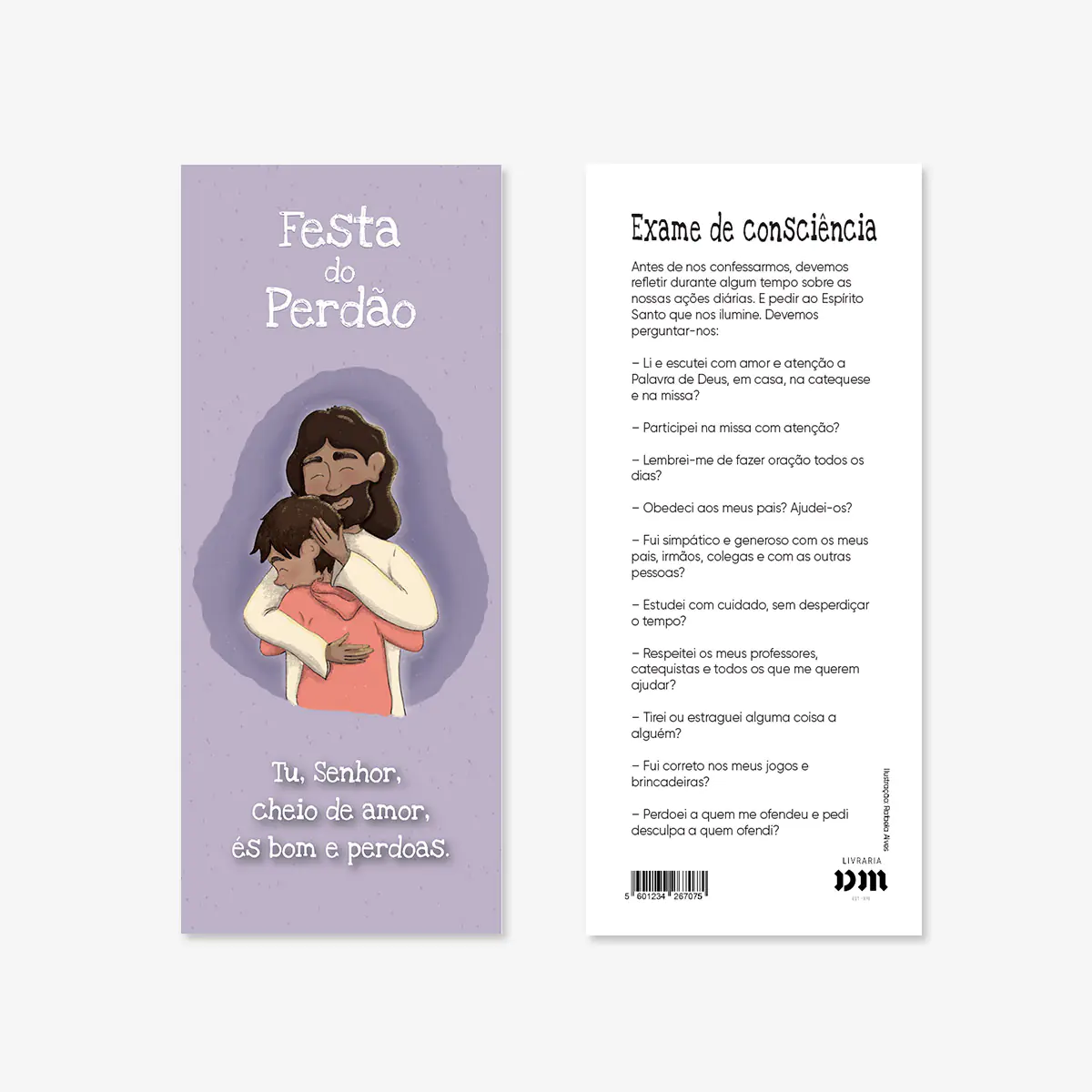 No verso, propõe um exame de consciência simples e adaptado às crianças, com perguntas que ajudam a preparar bem o coração para o sacramento da Reconciliação. Um recurso educativo e espiritual que acompanha os mais novos no caminho do perdão e da amizade com Deus.