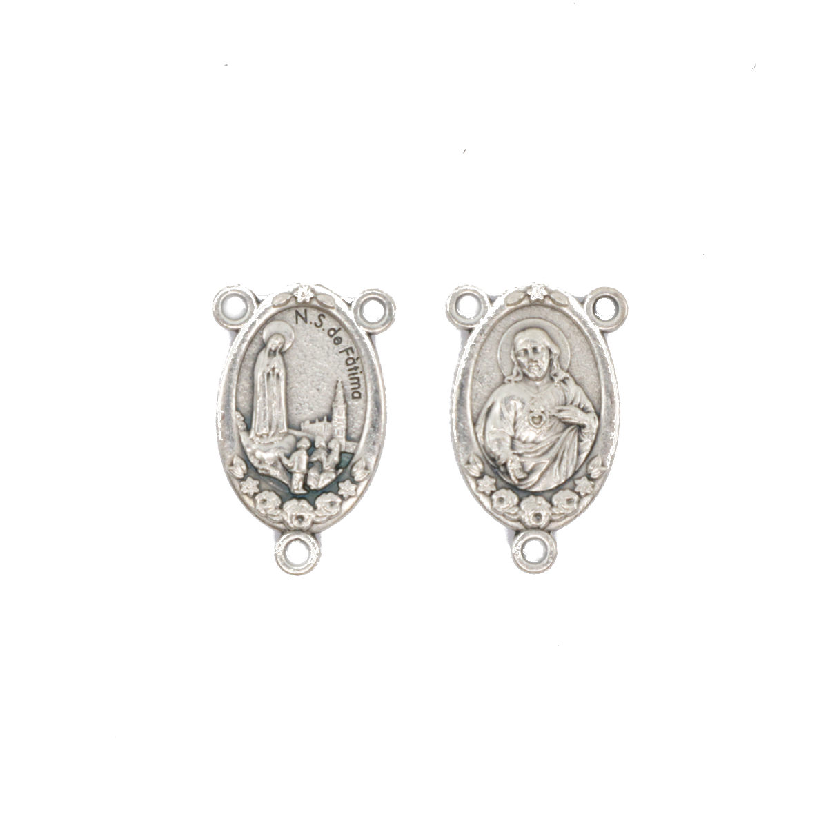 Medalha para terço Nossa Senhora de Fátima. Medalha oval para criação de terço com imagem da Nossa Senhora de Fátima e Sagrado Coração de Maria, realizada em metal prateado. Altura: 1,8 cm.
