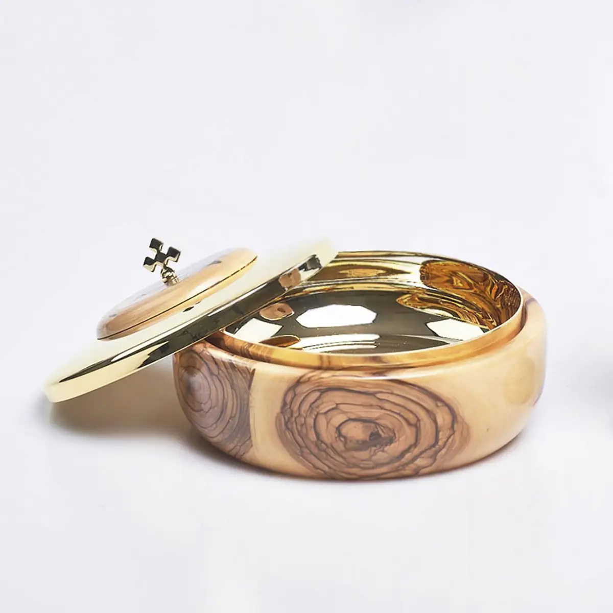 tampa dourada, encimada por pequena cruz, assegura a dignidade litúrgica do objeto, enquanto o contraste entre a madeira natural e o acabamento metálico sublinha a sobriedade e o cuidado artesanal. Uma peça que conjuga nobreza dos materiais, funcionalidade e respeito pela tradição eucarística.