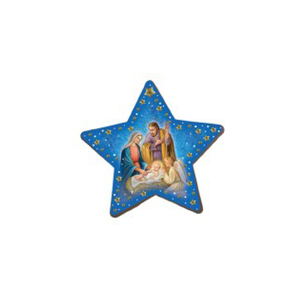 Estrela com fundo azul e pequenos astros dourados, ao centro a imagem delicada da Sagrada Família no presépio, rodeada por anjos.