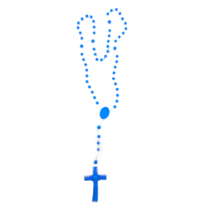 Terço de plástico várias cores, com imagem do sagrado coração de Jesus e a imagem da nossa senhora do Carmo.